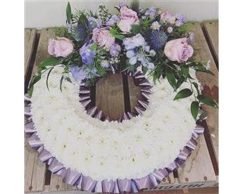Funeral wreath based in fresh white Chrysanthemums and finished with a mixed spray of flowers in your chosen colour scheme.